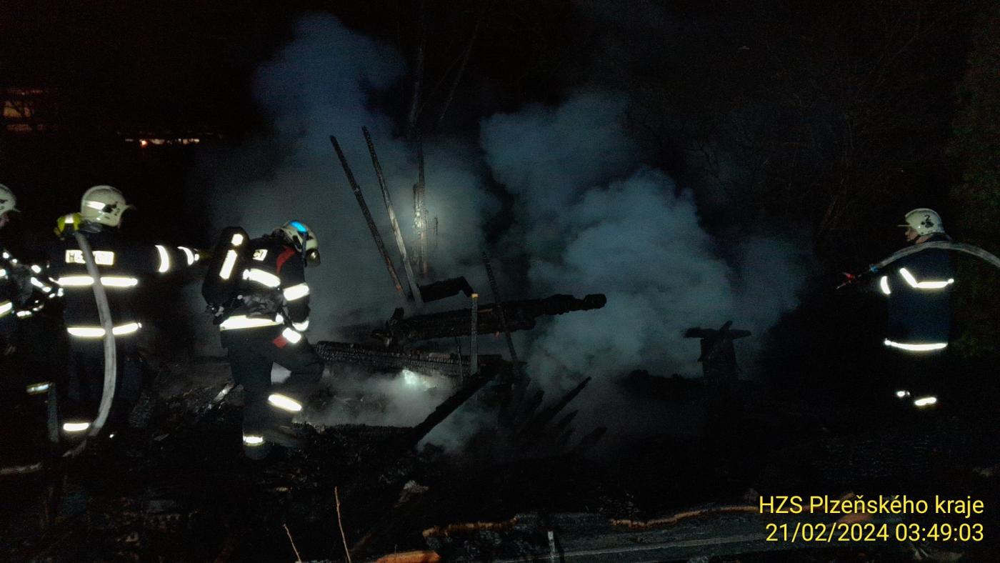 Podle mluvčího krajských hasičů Petra Poncara požár vypukl krátce před půl 3 v noci. "Chata o rozměrech asi 6 x 4 metry byla plně zasažena ohněm. Požár jsme dostali pod kontrolu do dvaceti minut od příjezdu první jednotky. Nasadili jsme dva vodní proudy," popsal.