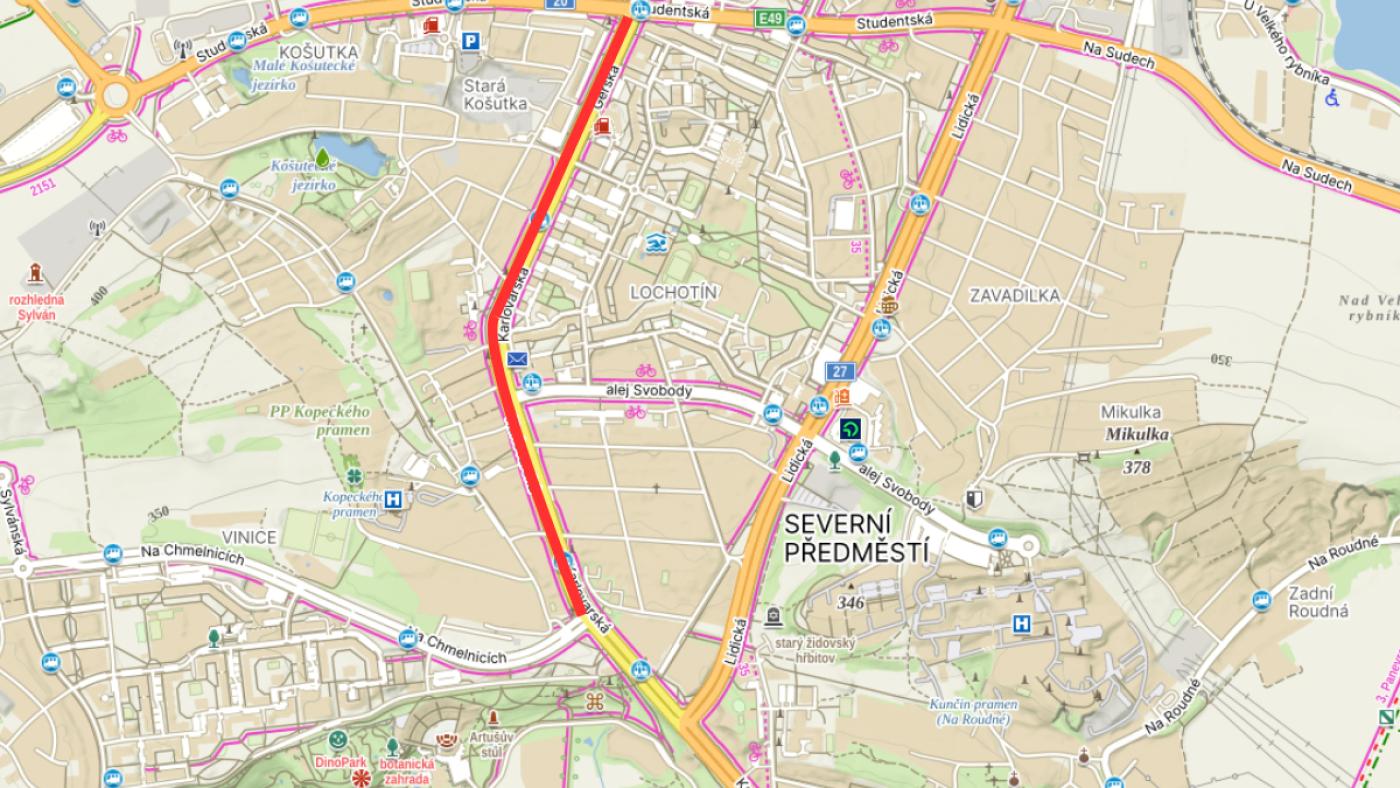 Průjezdnost bude zajištěna vždy jedním jízdním pruhem od křižovatky Gerské a Studentské ulice až po křižovatku ulic Karlovarská a Na Chmelnicích.