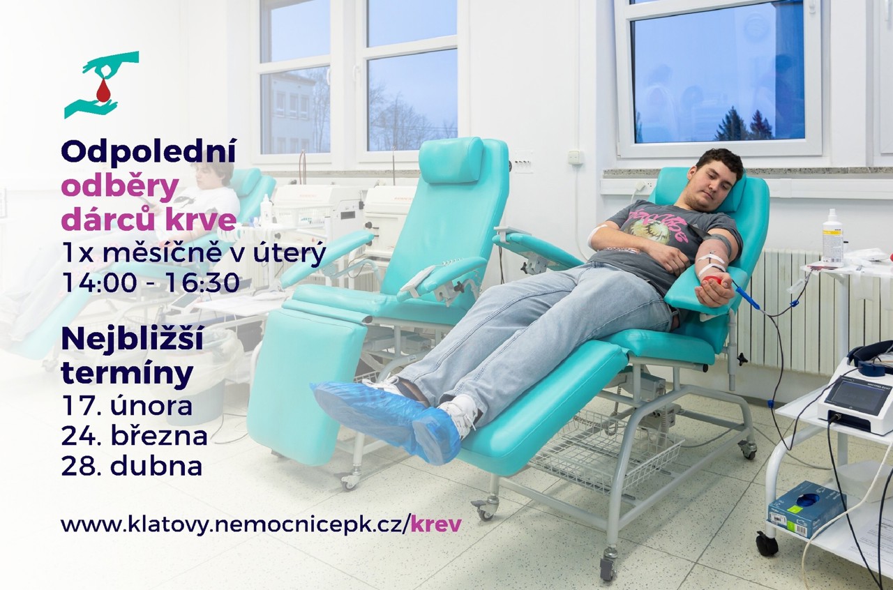 Chcete darovat krev, ale nevyhovují vám dopolední termíny? Klatovská nemocnice nabízí dárcům i v letošním roce možnost přijít v odpoledních hodinách. Odběry budou probíhat vždy jednou za měsíc a další možnost se naskytne už 24. března.