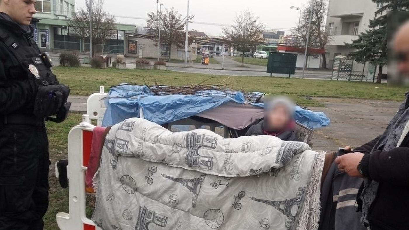 Přímo na betonovém prostranství náměstí Emila Škody si dva bezdomovci, jednapadesátiletý muž a osmatřicetiletá žena, postavili provizorní přístřešek, ve kterém se chystali nocovat. Byli přitom velmi kreativní. Vypůjčili si k tomu lavičky i zábrany používané k označením uzavírek.