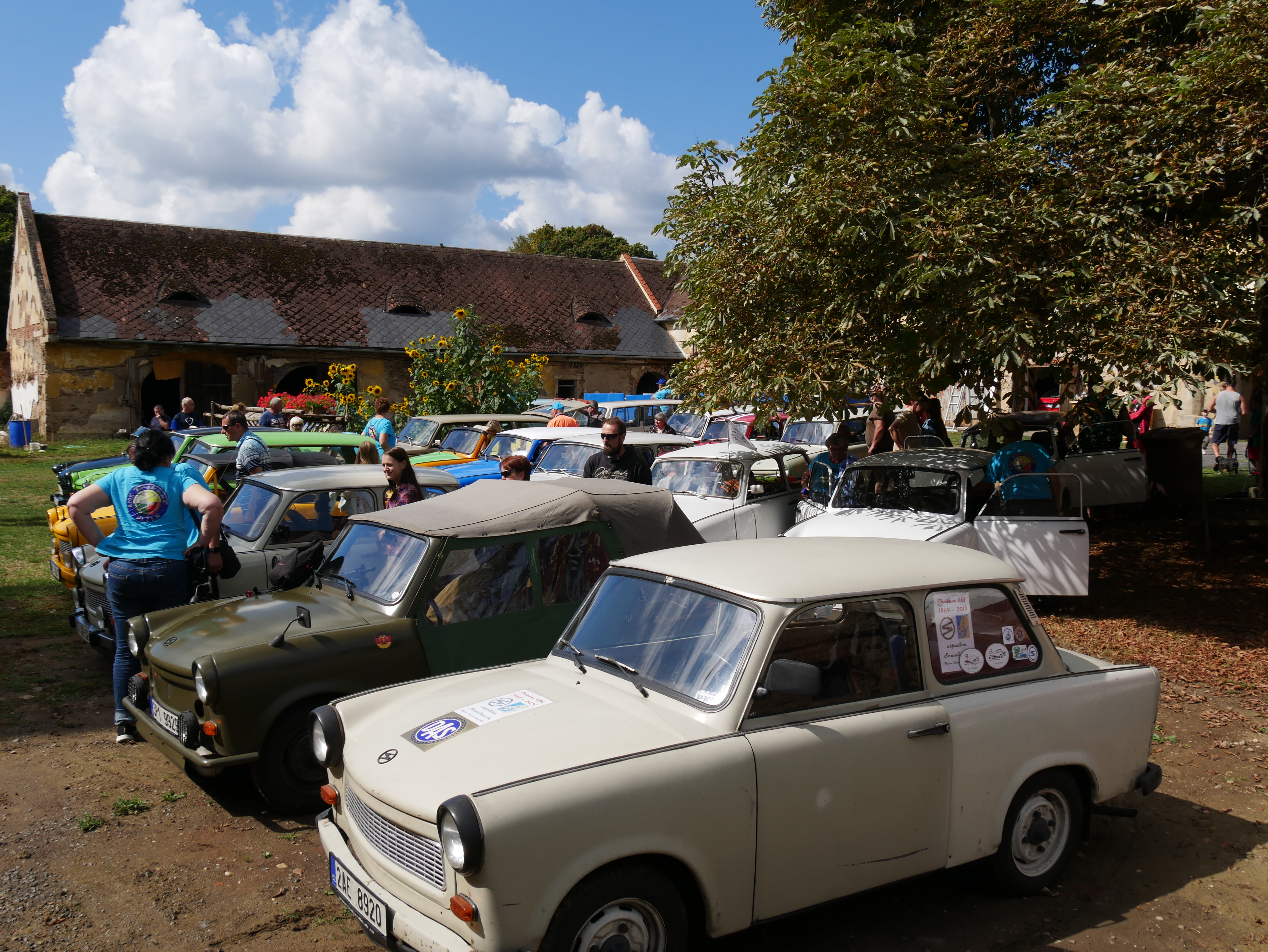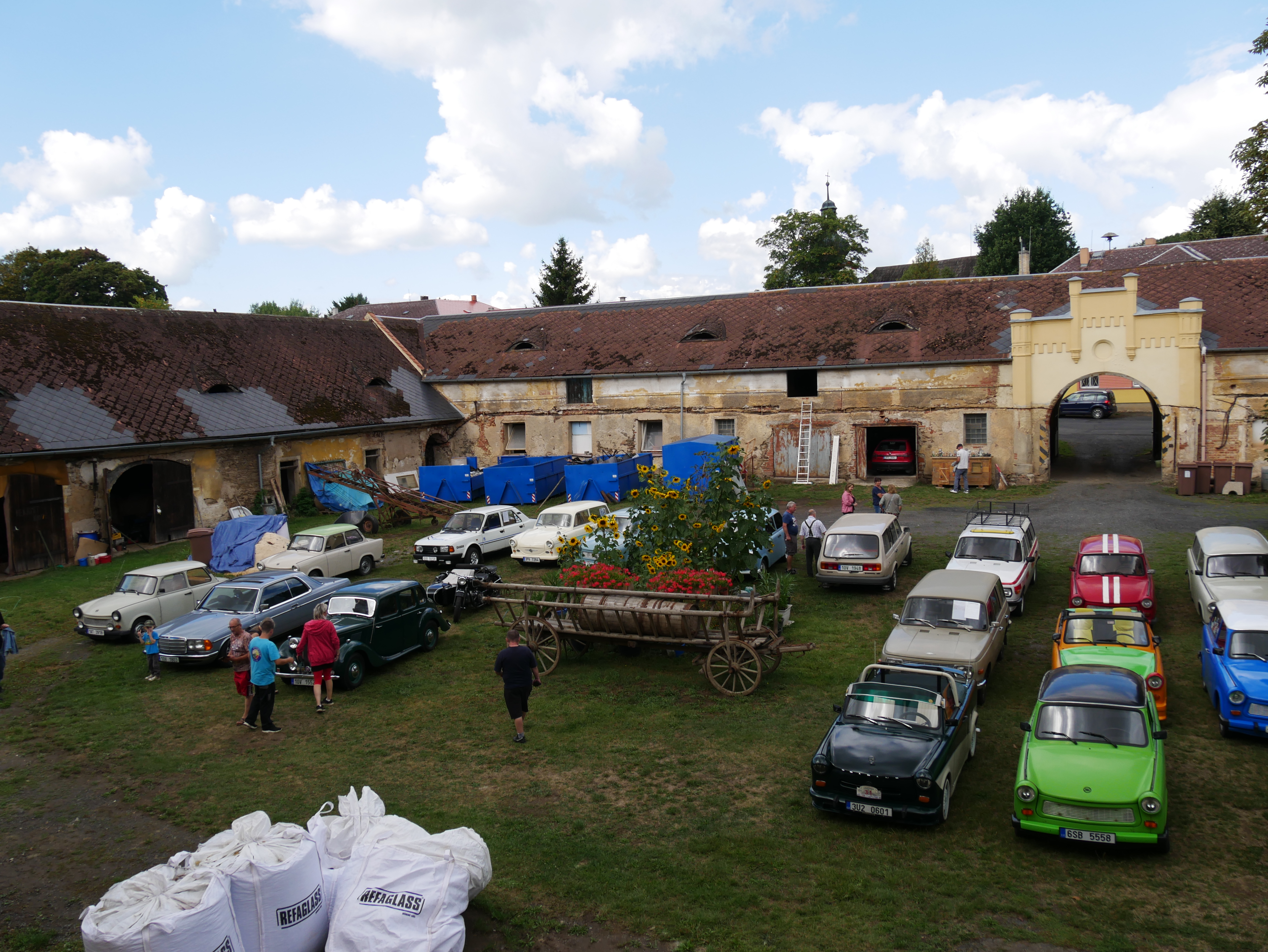 Po obědě v místní restauraci zamířili majitelé veteránů na nedaleký zámek Štědrá. Na nádvoří zámku zaparkovalo 20 trabantů (z toho 2 kabriolety a 1 kübelwagen), 3 wartburgy, mercedes z 80. let, Škoda 130, předválečný vůz MG s řízením vpravo a motorka se „sajdkárou“. Zámek nechal na počátku 18. století vybudovat Petr z Kokořova. Po roce 1945 v objektu sídlil státní statek a zemědělská škola. Po nepovedené privatizaci v 90. letech koupila zámek obec Štědrá, která jej od roku 2011 postupně opravuje. Účastníci prohlídky tak měli možnost vidět nejen zrekonstruované místnosti, ale i prostory, které na opravu teprve čekají, a dozvědět se přímo od starosty obce zajímavé informace o zámku i potížích při stavebních pracích.