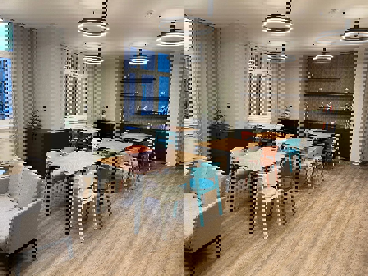 Z dotací IROP jsme také zrekonstruovali bývalou jídelnu v domě na Východní 16 a vytvořili z ní moderní společenskou místnost. Tento prostor je určen pro aktivity našich klientů – cvičení, rukodělné dílny, přednášky, společenské akce nebo setkávání komunit.