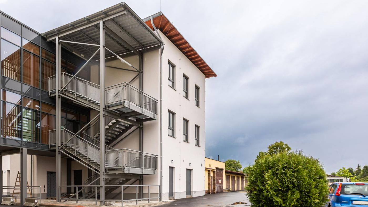 Stavba začala loni v lednu odstraněním garáží, které stály východně od hlavní budovy. Na podzim se dokončila budova zvenku a letos se už dodělávaly interiéry, fotovoltaická elektrárna na střeše a prosklený krček vedoucí do hlavní budovy. Právě napojení na druhé a třetí podlaží hlavní budovy je zásadní.