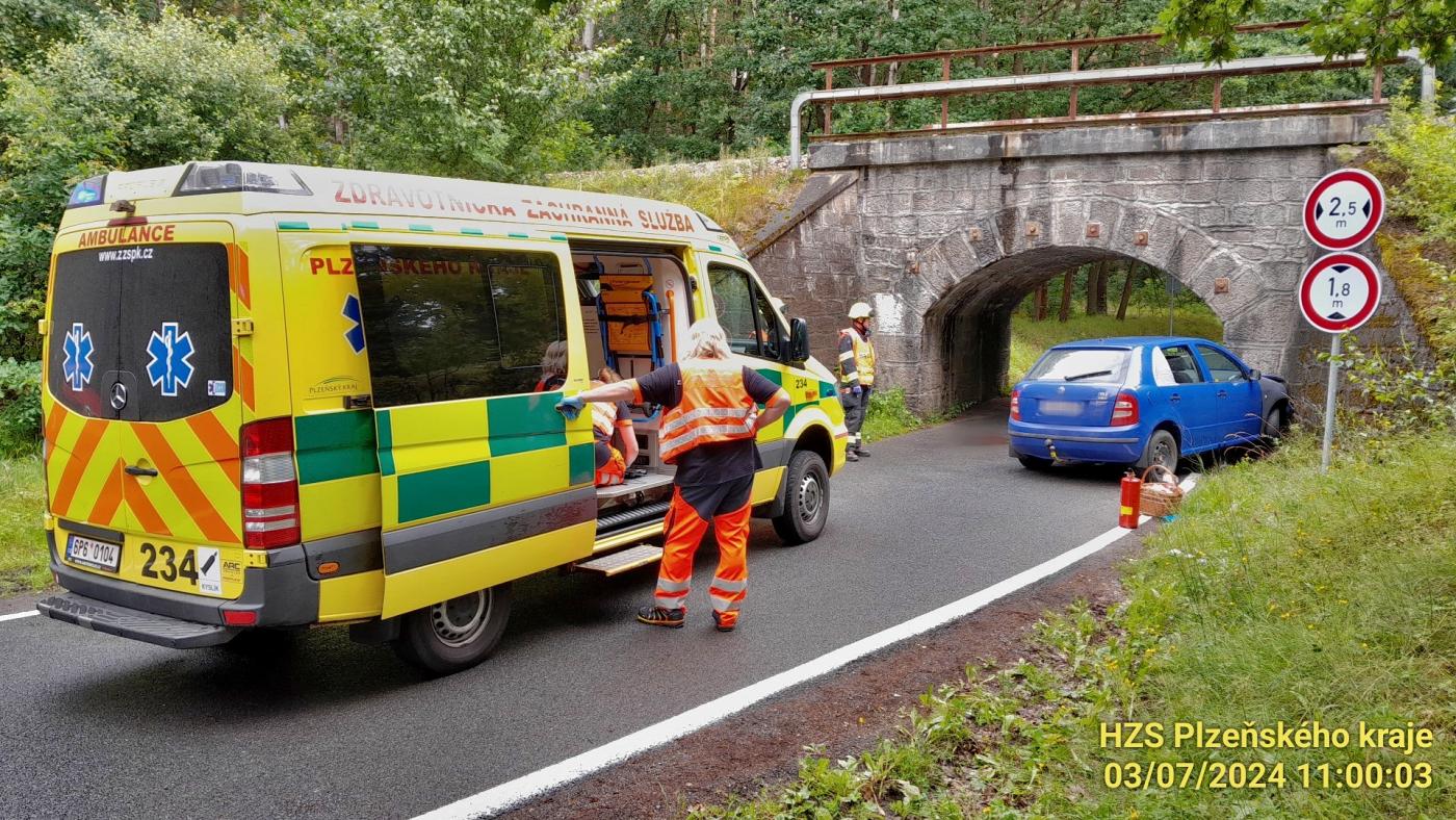 Tři lidé utrpěli zranění při nehodě osobního auta, která se stala na silnici třetí třídy mezi Horní Břízou a Oborou na severu Plzeňska. Vozidlo tam narazilo do železničního viaduktu.