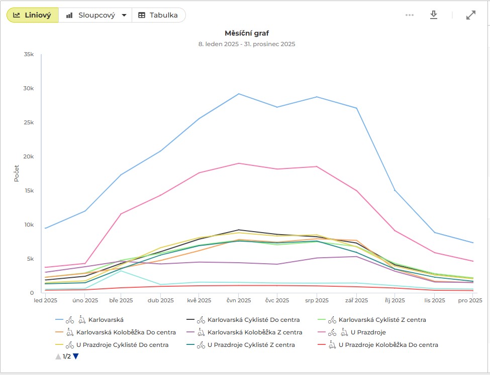 Od 8. ledna 2025 do konce loňského roku na cyklostezce U Prazdroje projelo přes 117 tisíc cyklistů a více než 24 tisíc koloběžek. Snímač v Karlovarské ulici za zmíněnou dobu zaznamenal 125 876 cyklistů a přes 102 tisíc koloběžek. Nejfrekventovanějšími dny byly v loňském roce úterý a čtvrtek. A průměry jsou 396 U Prazdroje a 638 cyklistů v Karlovarské za den. Z dat rovněž vyplynulo, že nejvíce cyklistů projelo úsekem U Prazdroje 13. března a kolem Rondelu 19. června. Březnový vrchol může ukazovat na nástup jarní sezóny a červnový rekord pravděpodobně souvisí s letním počasím a cestami za rekreací k Boleveckým rybníkům.