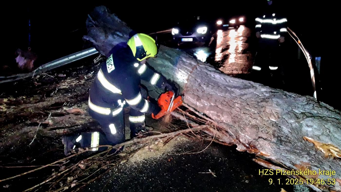 Rušný čtvrteční večer a noc prožili hasiči v Plzeňském kraji. Zaměstnával je silný vítr, který řádil po celém území. Ve dvou případech do spadlých stromů najel vlak.