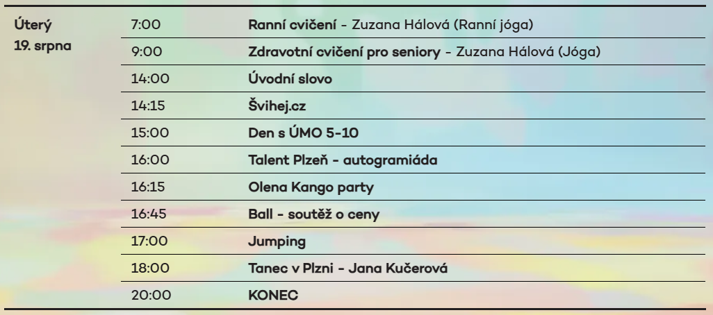 Sportovní fanoušci si užijí autogramiádu házenkářského klubu Talent Plzeň a chybět nebude ani jedinečná Olena Kango party. Návštěvníky čeká také soutěž Ball o atraktivní ceny, energický jumping a na závěr taneční vystoupení Jana Kučerové v projektu Tanec v Plzni.
