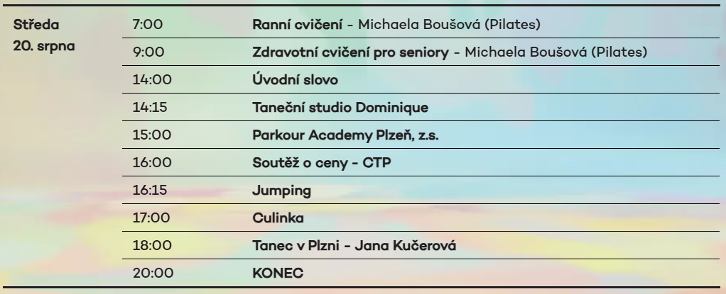 Odpoledne se můžete těšit na pestrou paletu vystoupení a aktivit. Na pódiu se představí Taneční studio Dominique, následovat bude adrenalinová ukázka Parkour Academy Plzeň a bude se také soutěžit o ceny se společností CTP.