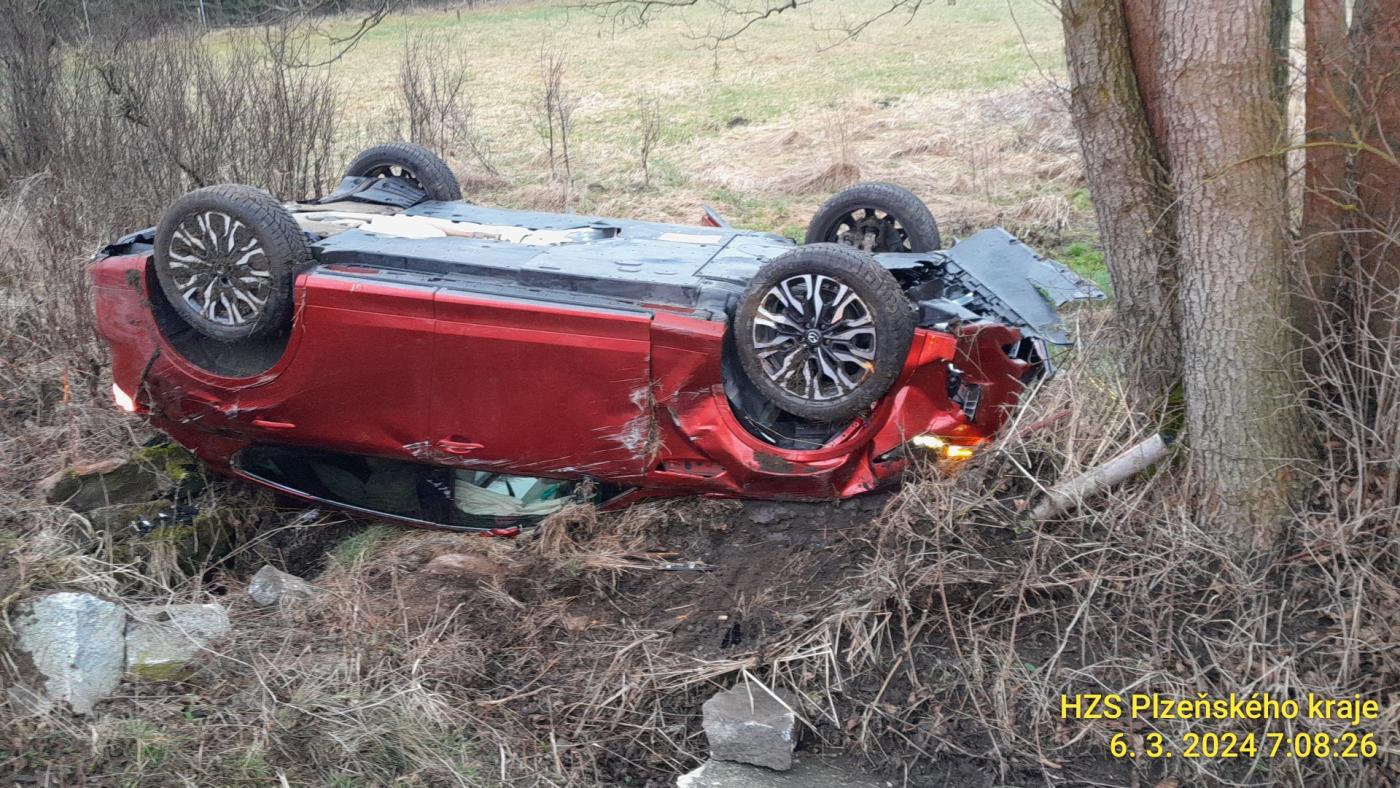 K dopravní nehodě došlo na silnici mezi obcemi Plánice a Hnačov před 7. hodinou. "Řidič ročník 1966 osobního vozidla tovární značky Mazda jel ve směru z obce Hnačov na obec Plánice. Pravděpodobně měl sjet s pravým kolem do příkopu, kdy při pokusu z něj vyjet, strhl řízení a s vozidlem sjel do protějšího příkopu, kde narazil do betonové vpusti a stromů. Spolu s ním byla ve vozu spolujezdkyně ročník 1931, která utrpěla zranění neslučitelná se životem," uvedla policejní mluvčí Barbora Šmaterová s tím, že řidič byl převezen záchrannou službou do nemocnice. Podle mluvčího krajských hasičů Petra Poncara jednotky na místě musely ženu i muže vyprostit.