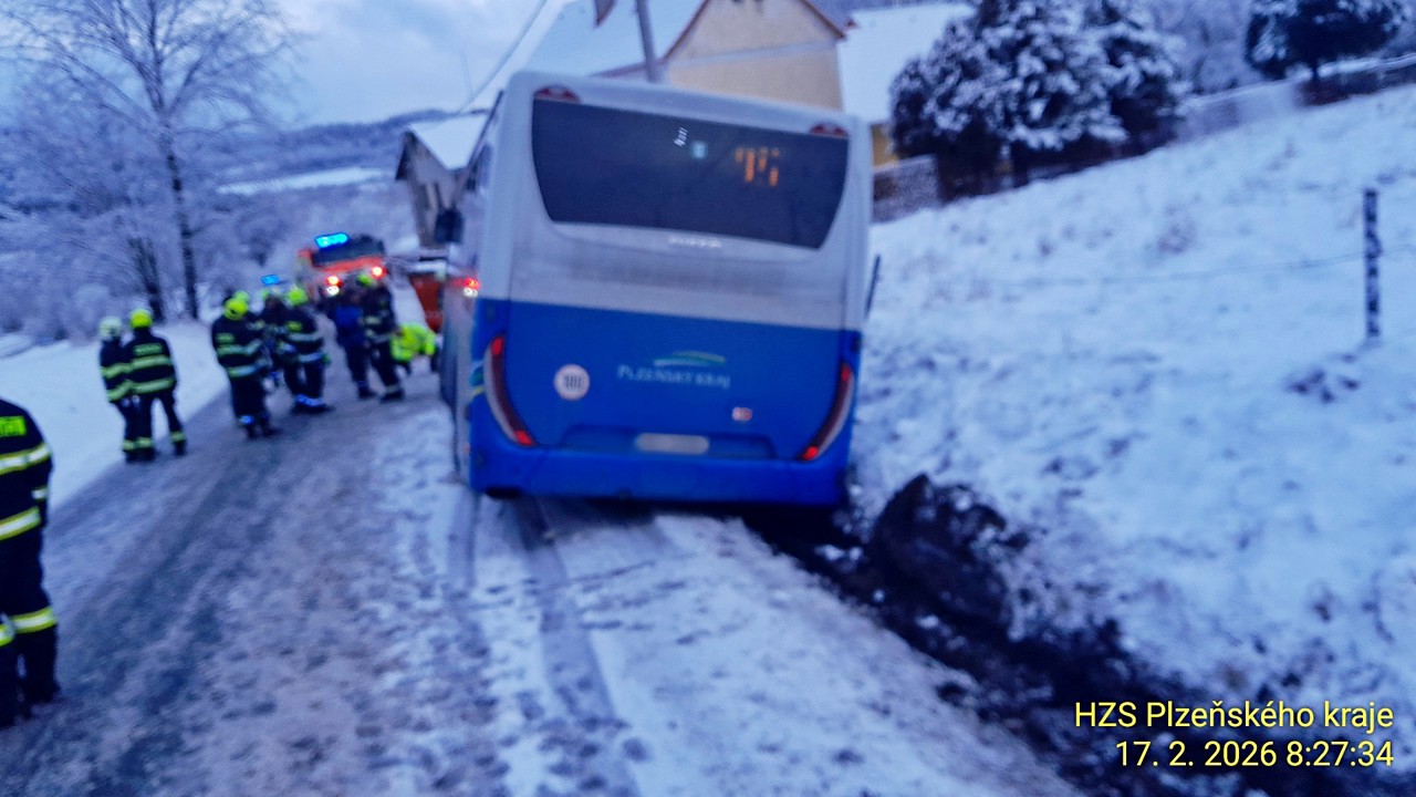 Autobus převážející skupinu dětí sjel na silnici II/171 u obce Strašín ze silnice do příkopu, kde zůstal ležet na boku. Hasiči museli cestující dostávat z vozidla okýnkem u řidiče.