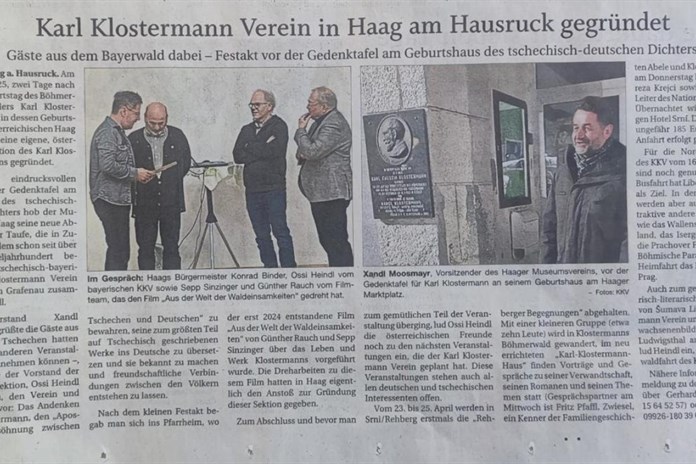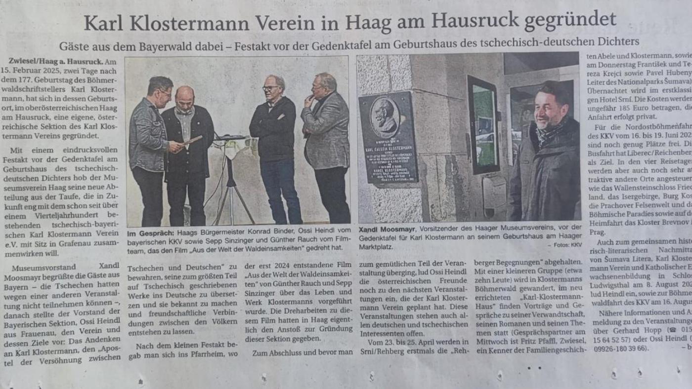 15. února 2025, dva dny po 176. narozeninách šumavského spisovatele Karla Klostermanna, byla v jeho rodišti Haag im Hausruck v Horním Rakousku založena samostatná rakouská sekce Spolku Karla Klostermanna.