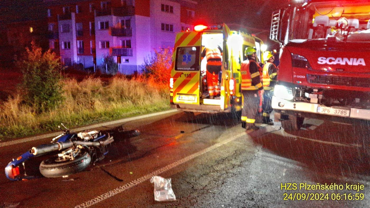 "Dnes ráno v 5:55 hodin došlo na Nepomucké třídě v Plzni před kruhovým objezdem u Olympie k dopravní nehodě. Došlo ke střetu osobního vozidla tovární značky Škoda Scala řidičky narozené v roce 1972 a motocyklu Suzuki řidiče narozeného v roce 1978. Po nárazu upadl motocyklista do protisměrné části vozovky, kde došlo ke střetu s protijedoucím osobním vozidlem Fiat řidiče narozeného v roce 1965," popsala policejní mluvčí Dagmar Brožová.