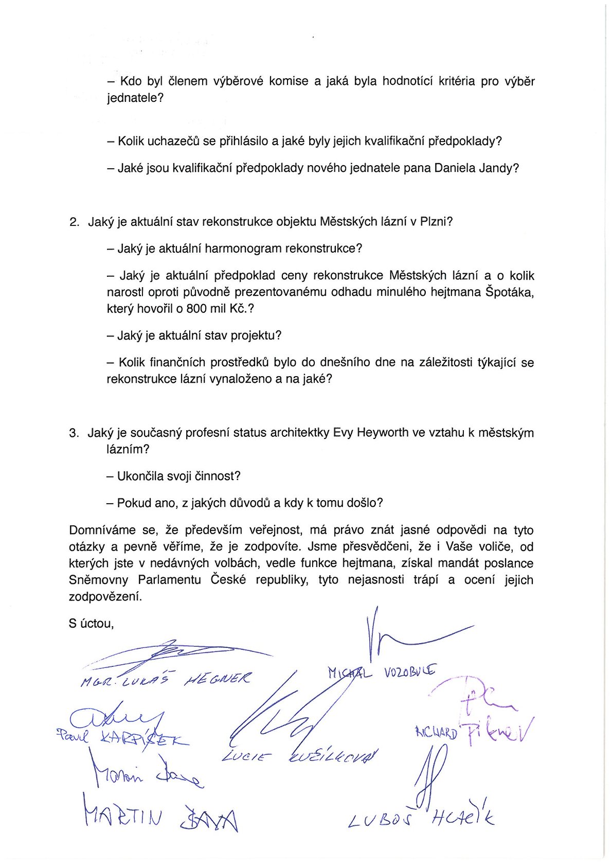 Zastupitelé ODS a TOP 09 zaslali otevřený dopis hejtmanovi Kamalovi Farhanovi s výzvou o poskytnutí informací týkajících se činnosti společnosti Kulturní centrum Plzeňského kraje, která je zřízena Plzeňským krajem, a současně i žádost o informace ohledně aktuálního stavu rekonstrukce Městských lázní v Plzni.