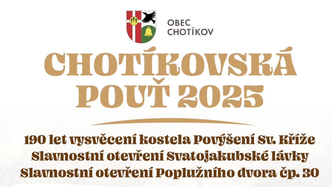 Obec Chotíkov srdečně zve na letošní chotíkovskou pouť, během které můžete oslavit 190 let vysvěcení kostela a také bude slavnostně otevřena Svatojakubská lávka a Poplužní dvůr. Akce se koná ve dnech 11. - 14. září.