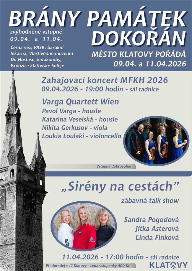 „Město Klatovy je dlouholetým členem Sdružení historických sídel Čech, Moravy a Slezska, které akci Brány památek dokořán organizuje. Členská města se tak připojují k Mezinárodnímu dni památek a sídel, který připadá na 18. dubna, a v tomto měsíci otevírají památky, pořádají prohlídkové okruhy, výstavy, koncerty, přednášky,“ řekl klatovský místostarosta Martin Kříž. Dějištěm kulturního programu bude po oba dny sál klatovské radnice.