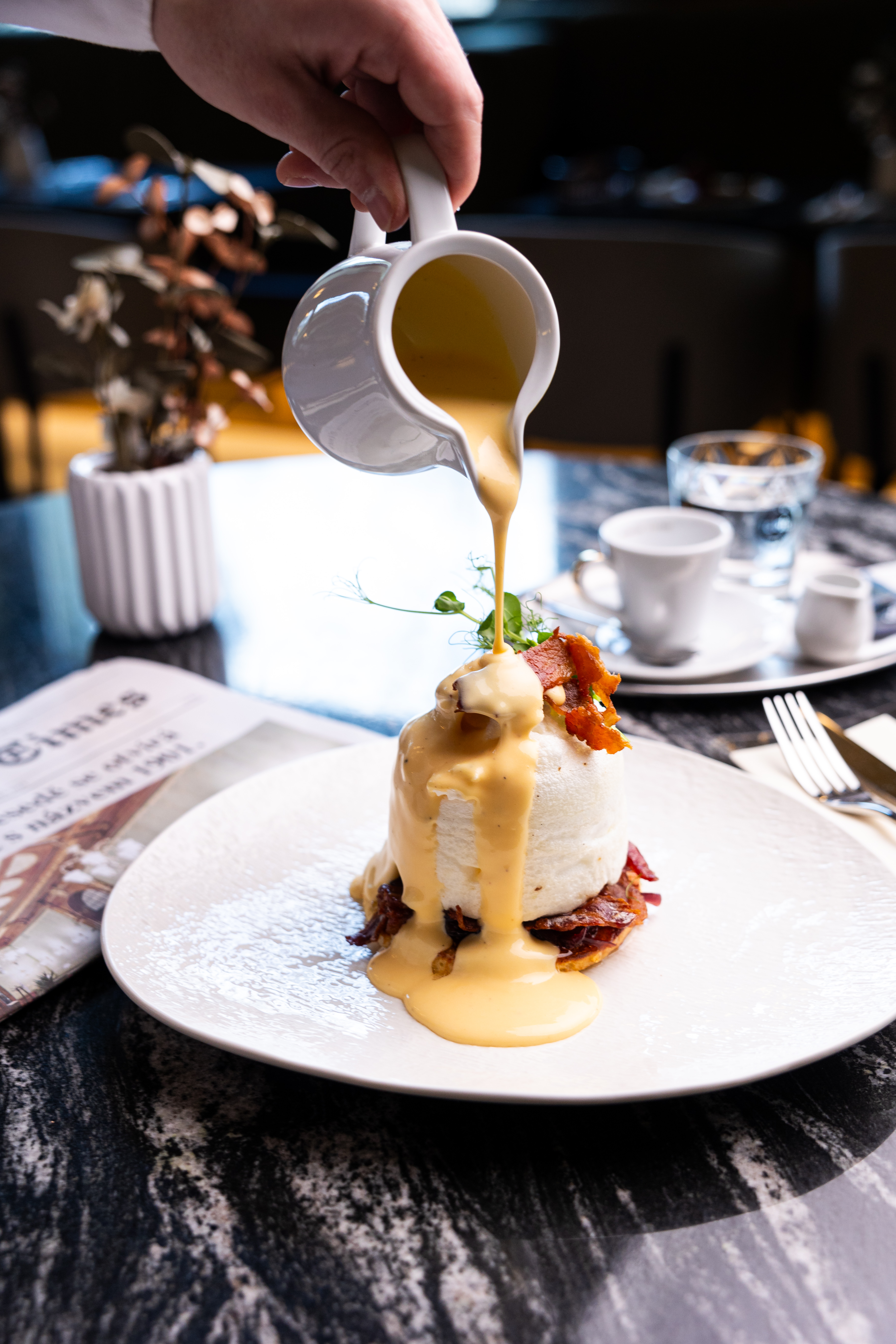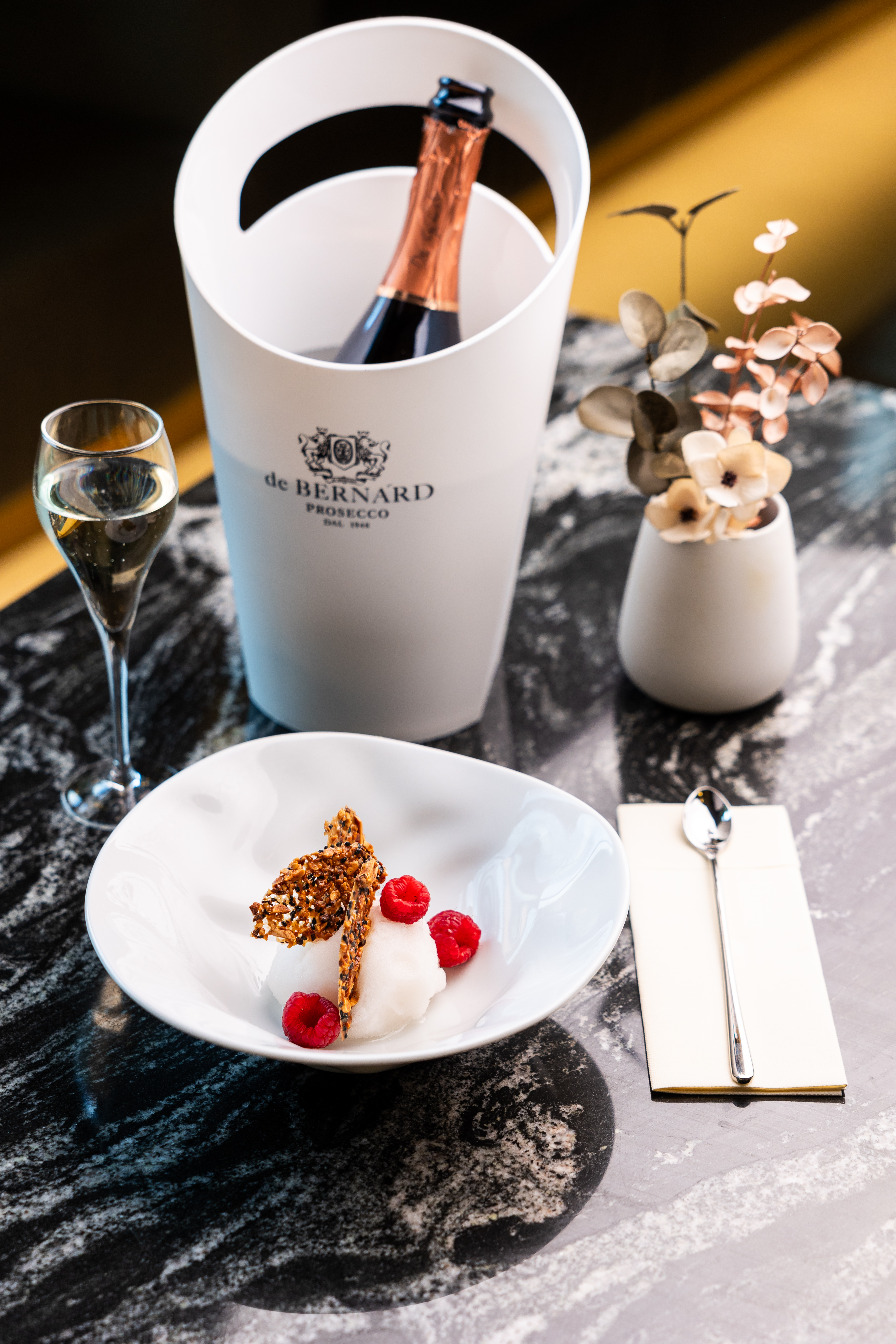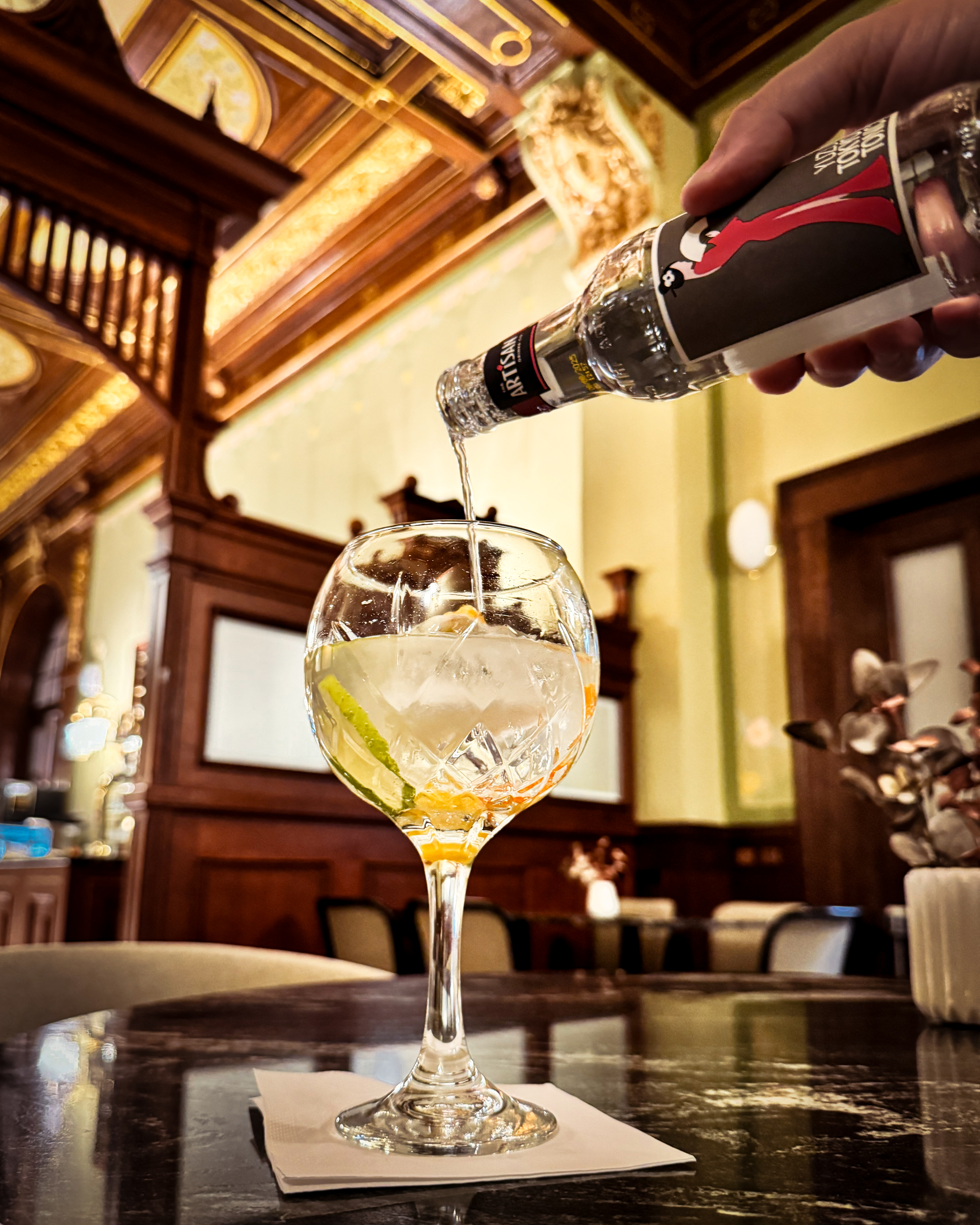 Během poledních hodin je hostům k dispozici polední menu společně s celodenní stálou nabídkou, která je inspirována tradiční francouzskou kuchyní. Po celý den si pak návštěvníci mohou vybrat z velké nabídky ginů, zahrnující dvacet druhů z celého světa, snoubené s doporučeným výběrem toniků.