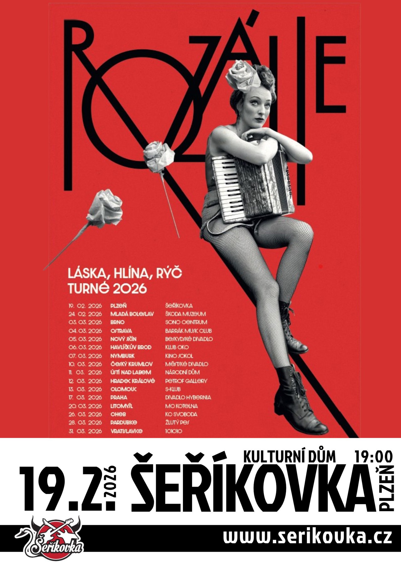 Charismatická zpěvačka, akordeonistka a autorka Rozálie se svou kapelou vyráží na turné, během kterého představí své oceňované album Láska, hlína, rýč a řadu dalších autorských písní. Stejně jako na předchozích koncertech ani tentokrát nebudou chybět její autentické příběhy, které vypráví se svým syrovým humorem a uhrančivým půvabem a divákům tak přibližuje, co za vznikem písní stojí. Rozáliino druhé album Láska, hlína, rýč (2024) se okamžitě stalo jedním z nejoceňovanějších titulů roku. Získalo hned několik nominací na Ceny Anděl, včetně interpretky roku, a ve výročním best of výběru magazínu Headliner patřilo mezi nejskloňovanější nahrávky. Hudební publicista Josef Vlček jej označil za „vzpurné generační gesto“. Vstupenky kupujte zde.