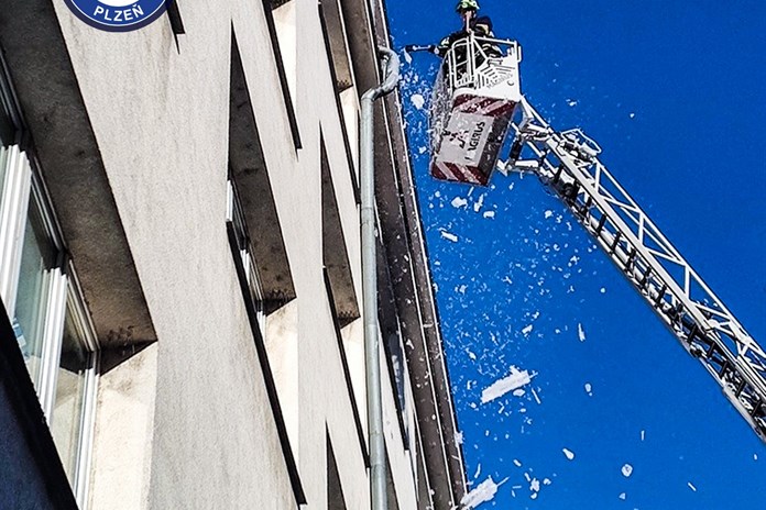 Frekventovaná Sladkovského ulice v Plzni musela být v neděli dopoledne částečně uzavřena. Ze střechy jednoho z domů přímo nad zastávkou MHD začaly na chodník padat kusy ledu. Kvůli bezpečnosti kolemjdoucích i řidičů musela městská policie okamžitě vytvořit bezpečný perimetr a povolat na pomoc hasiče s technikou.