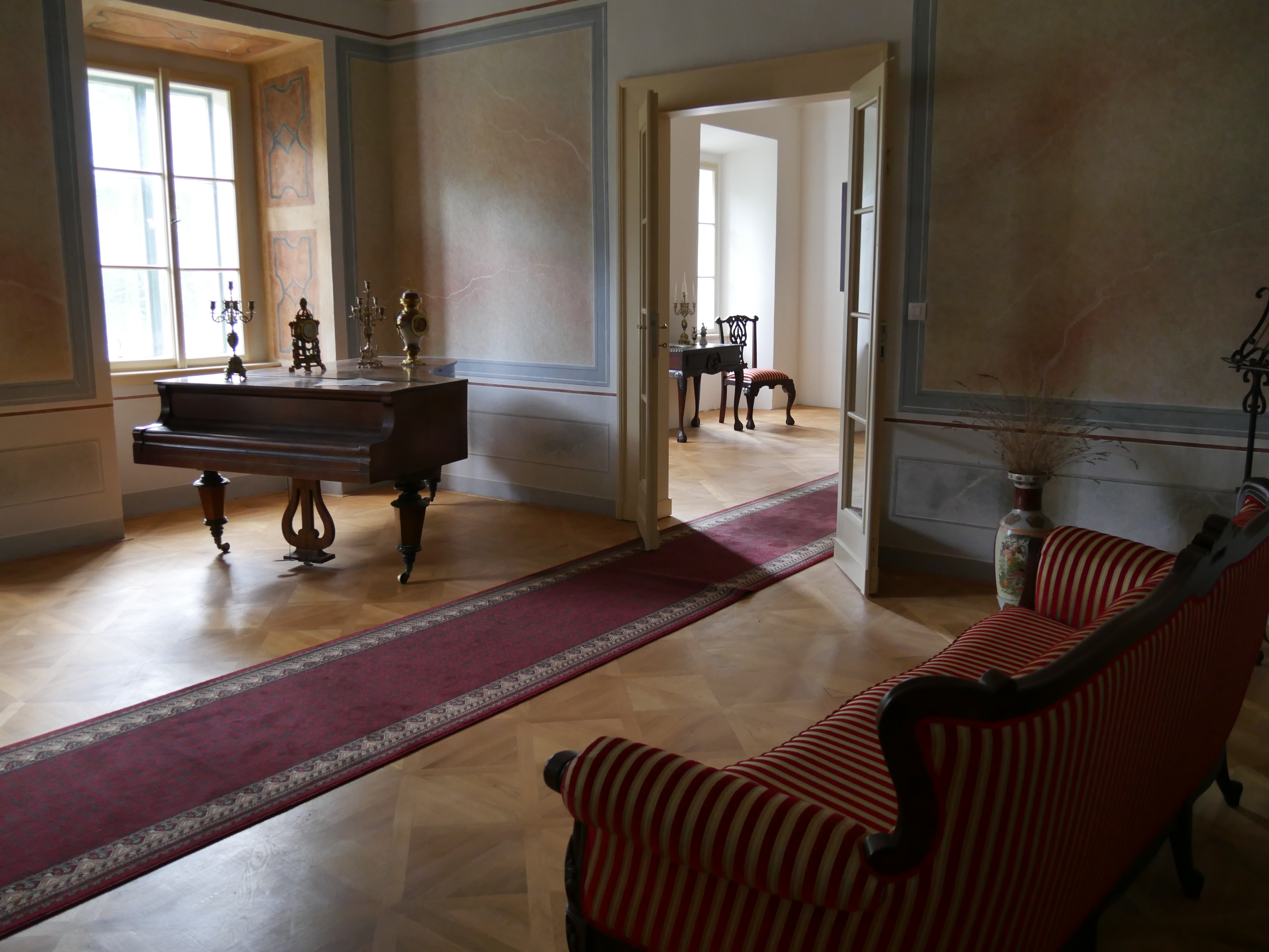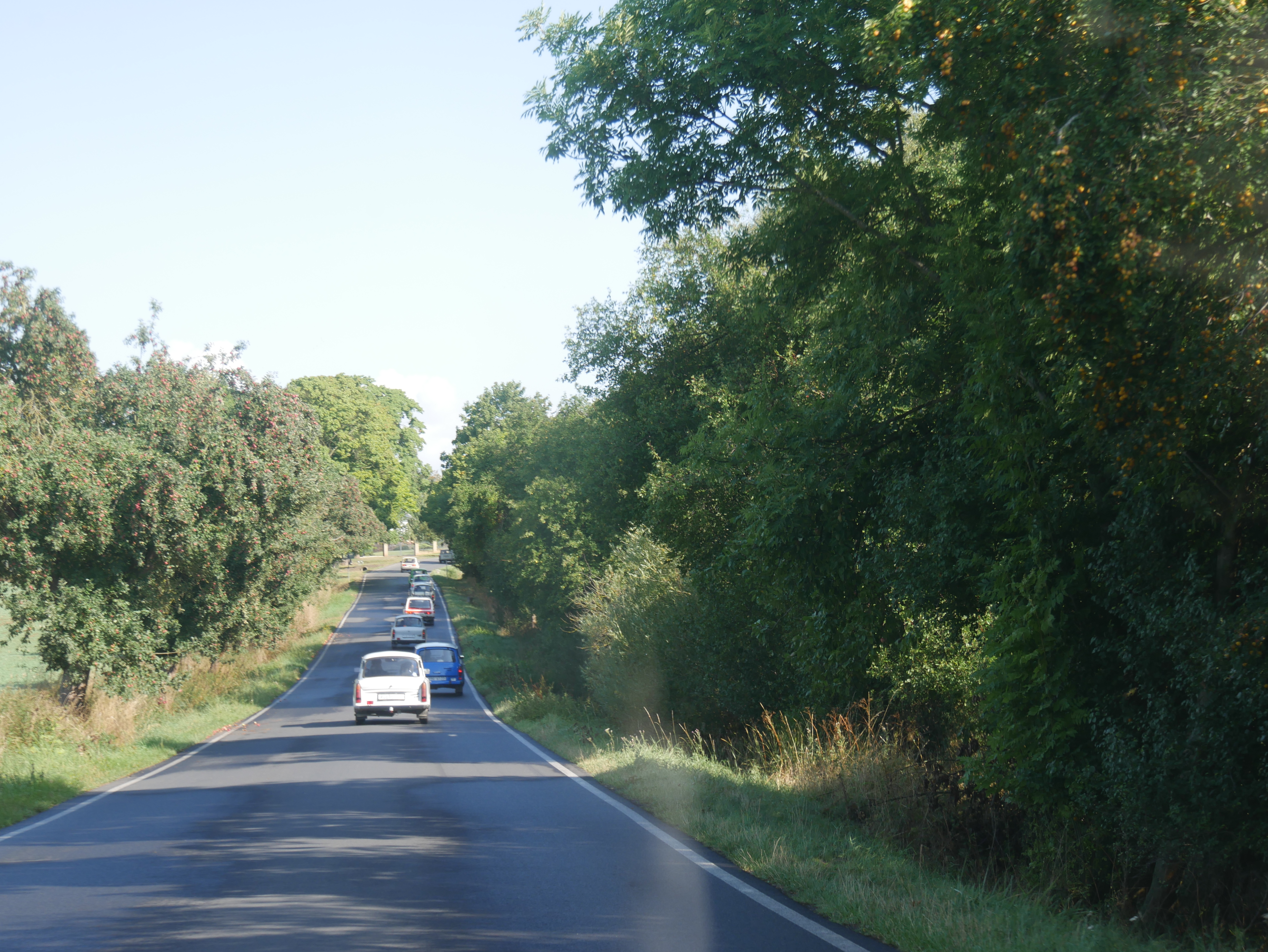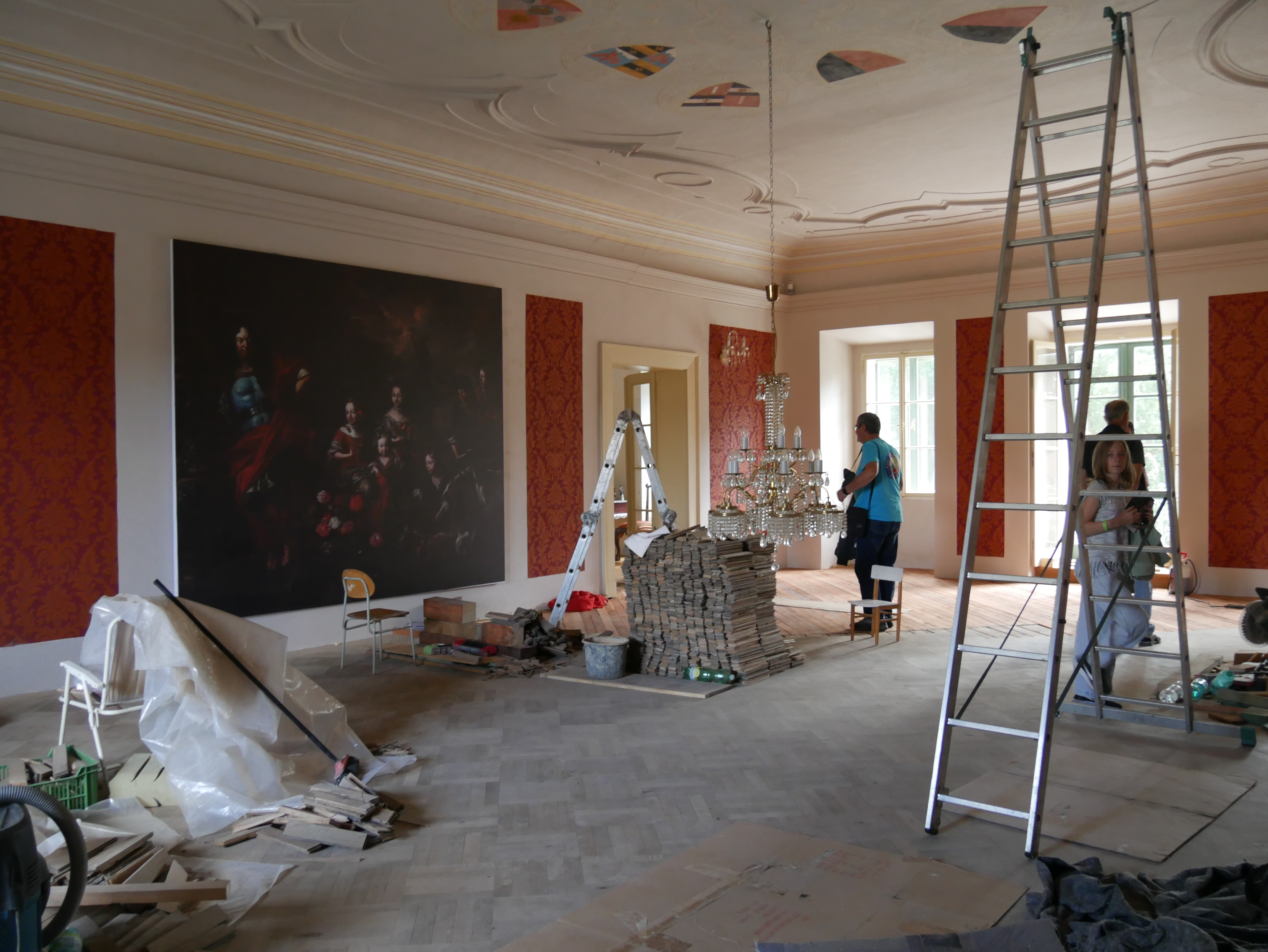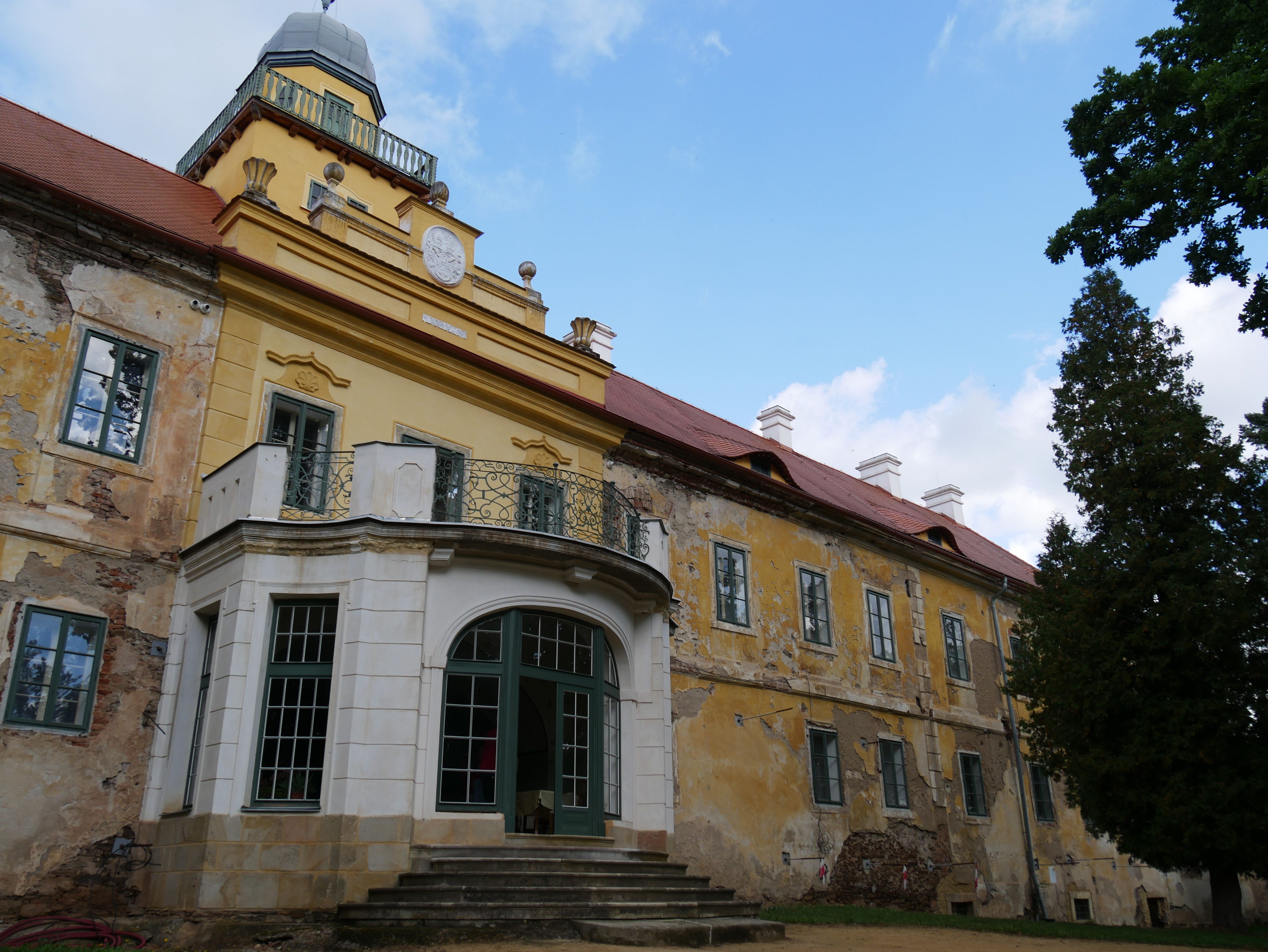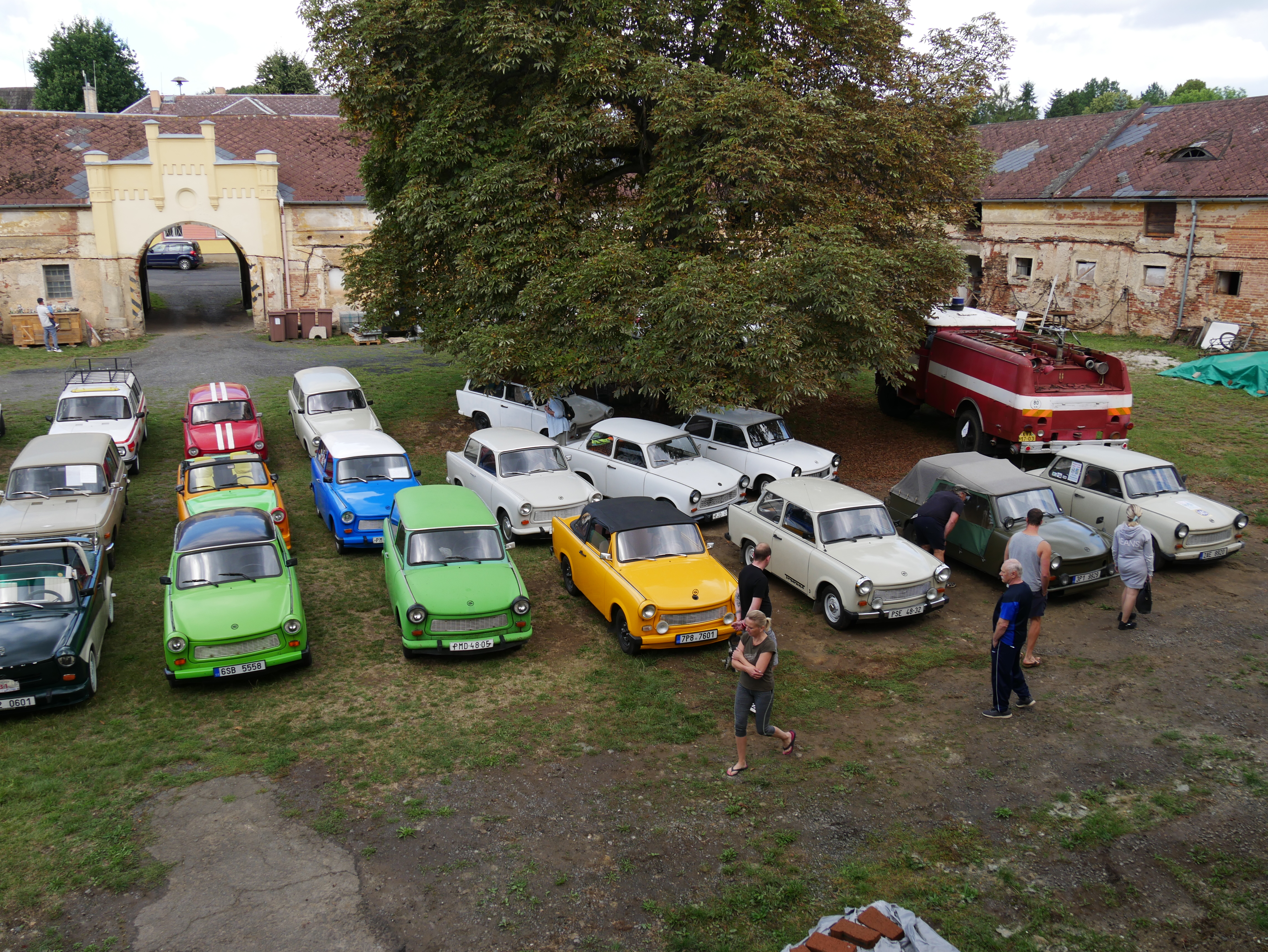 Po obědě v místní restauraci zamířili majitelé veteránů na nedaleký zámek Štědrá. Na nádvoří zámku zaparkovalo 20 trabantů (z toho 2 kabriolety a 1 kübelwagen), 3 wartburgy, mercedes z 80. let, Škoda 130, předválečný vůz MG s řízením vpravo a motorka se „sajdkárou“. Zámek nechal na počátku 18. století vybudovat Petr z Kokořova. Po roce 1945 v objektu sídlil státní statek a zemědělská škola. Po nepovedené privatizaci v 90. letech koupila zámek obec Štědrá, která jej od roku 2011 postupně opravuje. Účastníci prohlídky tak měli možnost vidět nejen zrekonstruované místnosti, ale i prostory, které na opravu teprve čekají, a dozvědět se přímo od starosty obce zajímavé informace o zámku i potížích při stavebních pracích.