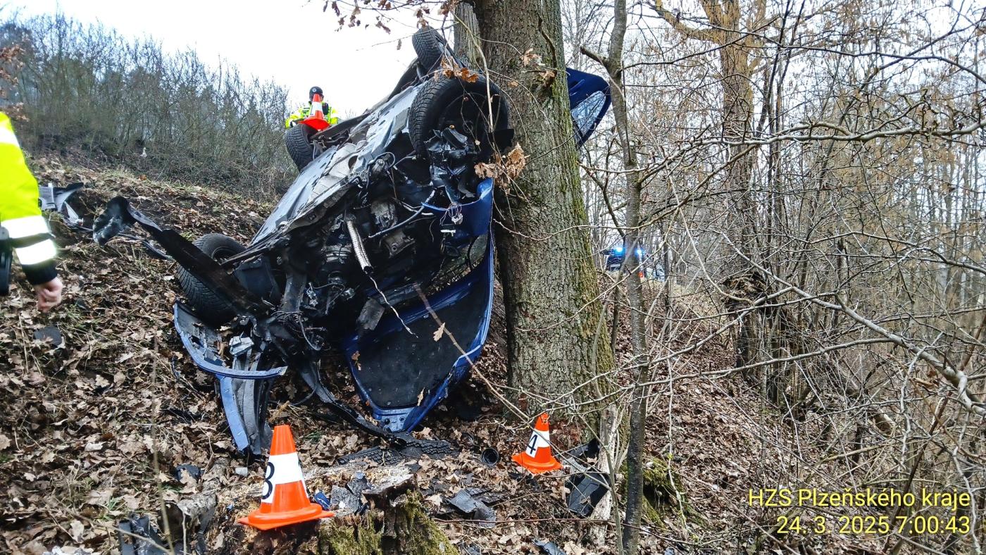 K dopravní nehodě došlo dnes krátce před půl 7 ránou na silnici II. třídy č. 197 mezi obcemi Újezd Svatého Kříže a Bělá nad Radbuzou. "Řidič ročník 1999 osobního vozidla Škoda jel ve směru od obce Újezd Svatého Kříže, kdy zřejmě po projetí mírné pravotočivé zatáčky najel na rovném úseku komunikace na pravou krajnici a poté s vozidlem vyjel vpravo za pravý okraj silnice, kde pod její úrovní narazil do pařezu. Následkem nárazu se z vozidla uvolnil motor, auto se přetočilo na střechu a tou se zastavilo o stromy," popsala policejní mluvčí Barbora Šmaterová.