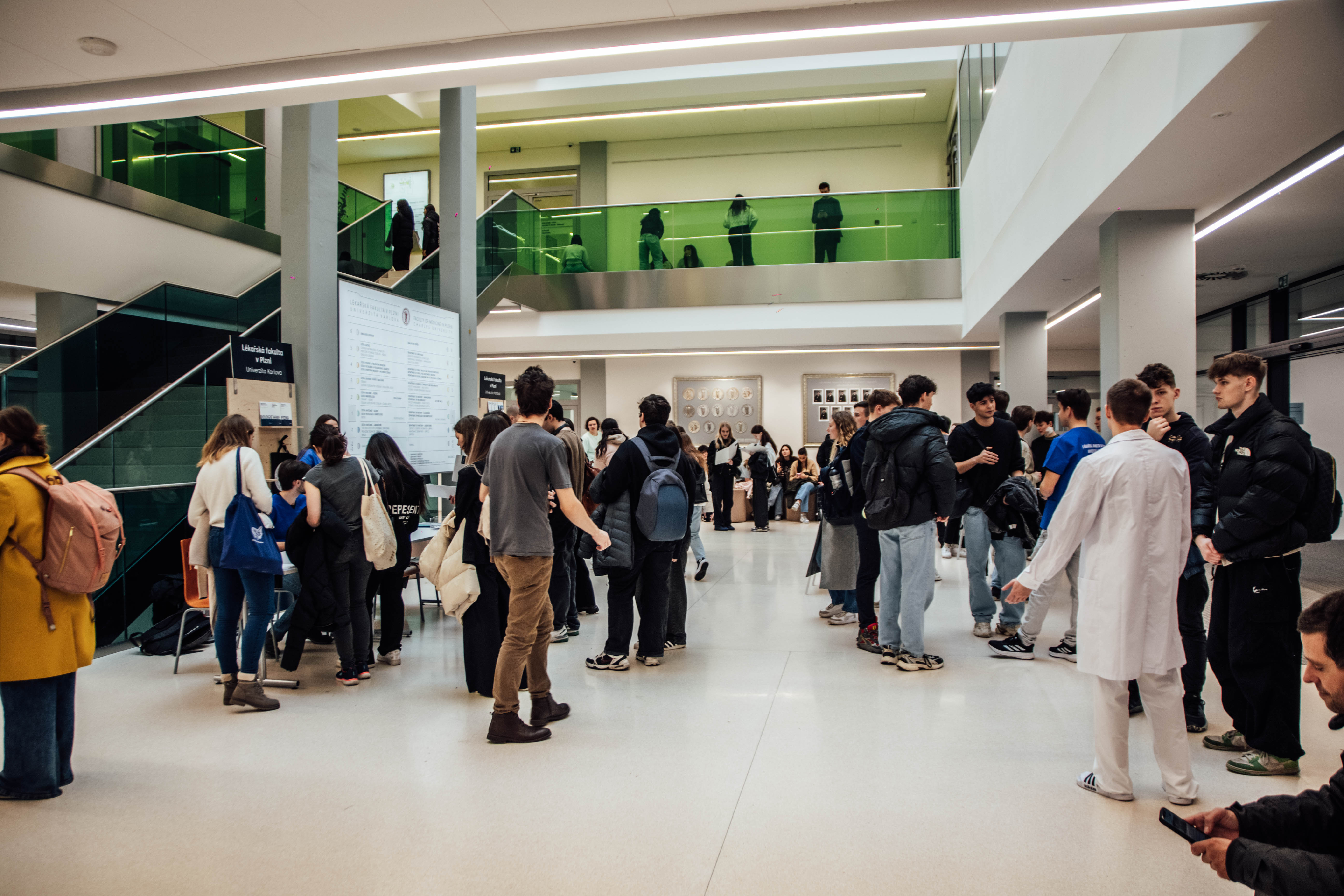 V jednotlivých patrech budovy budou mít své stánky studentské spolky. Uchazeči dostanou příležitost zeptat se současných mediků na jejich zkušenosti, seznámit se s činností spolků a také si některé úkony, jako třeba resuscitaci nebo práci na laparoskopickém trenažéru, sami vyzkoušet.