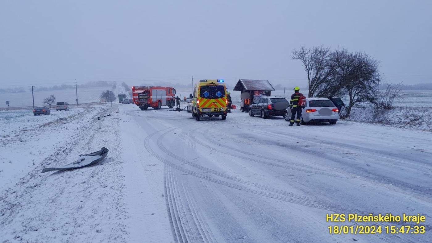 "Z dosavadního šetření je pravděpodobné, že řidička osobního auta Škoda neměla přizpůsobit rychlost jízdy povaze a stavu vozovky, narazila do před ní jedoucího vozidla VW, po nárazu se její vozidlo dostalo do protisměru, kde se střetla s protijedoucím vozidlem Audi, které se po nárazu roztočilo a došlo k čelnímu střetu s dodávkou jedoucí od Plzně," popsala nehodu policejní mluvčí Hana Kroftová.