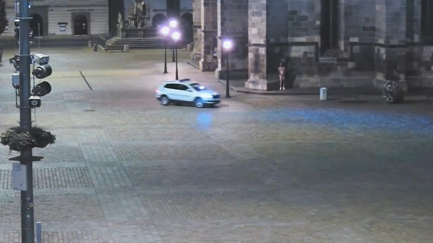 Protože jeho počínání nešlo vůbec přehlédnout, na místo představení už mířila hlídka strážníků. Naháč se snažil schovat ve stínu katedrály, ale bohužel pro něj jeho bílé pozadí ho činilo dobře viditelným už od morového sloupu. Strážníci si ho tak s přehledem nadjeli.