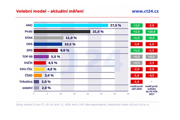 Podle některých průzkumů by Pirátská strana ve sněmovních volbách mohla atakovat hranici 21 % hlasů. Takový výsledek by znamenal velkou šanci na křeslo předsedy vlády. Více preferenčních hlasů než ODS má například v průzkumu agentury Kantar CZ i hnutí STAN.