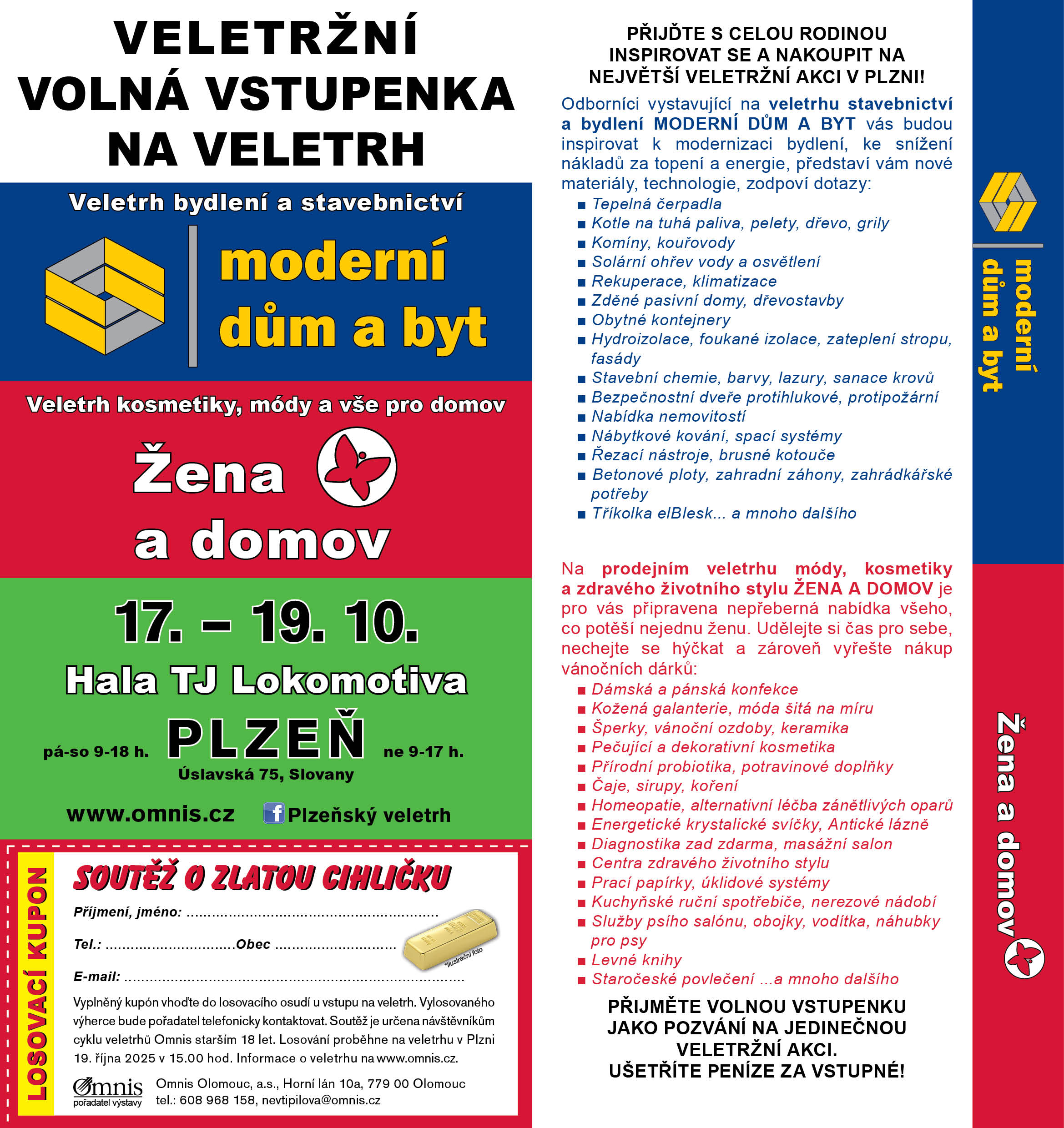 Vstupní prostor veletrhu nabídne návštěvníkům informační materiály, časopisy a možnost zapojit se do losování o zlatou cihličku. K dispozici bude také veletržní kavárna, kde si mohou návštěvníci odpočinout u šálku dobré kávy. Celý víkendový program je koncipován jako akce pro celou rodinu, která spojuje praktické informace, zábavu a inspiraci pro lepší životní styl.