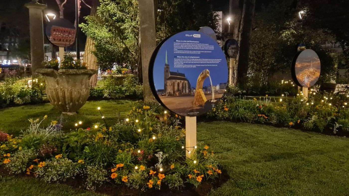 „Plzeň se v Cervii představuje ve fotografiích města ve večerním osvětlení. Kompozici dokresluje vlna zelené energie v podobě květinového záhonu osvětleného v noci malými solárními světélky,“ popslala návrh expozice jeho autorka Jana Pechová z oddělení přípravy staveb a urbanistické zeleně Správy veřejného statku města Plzně.