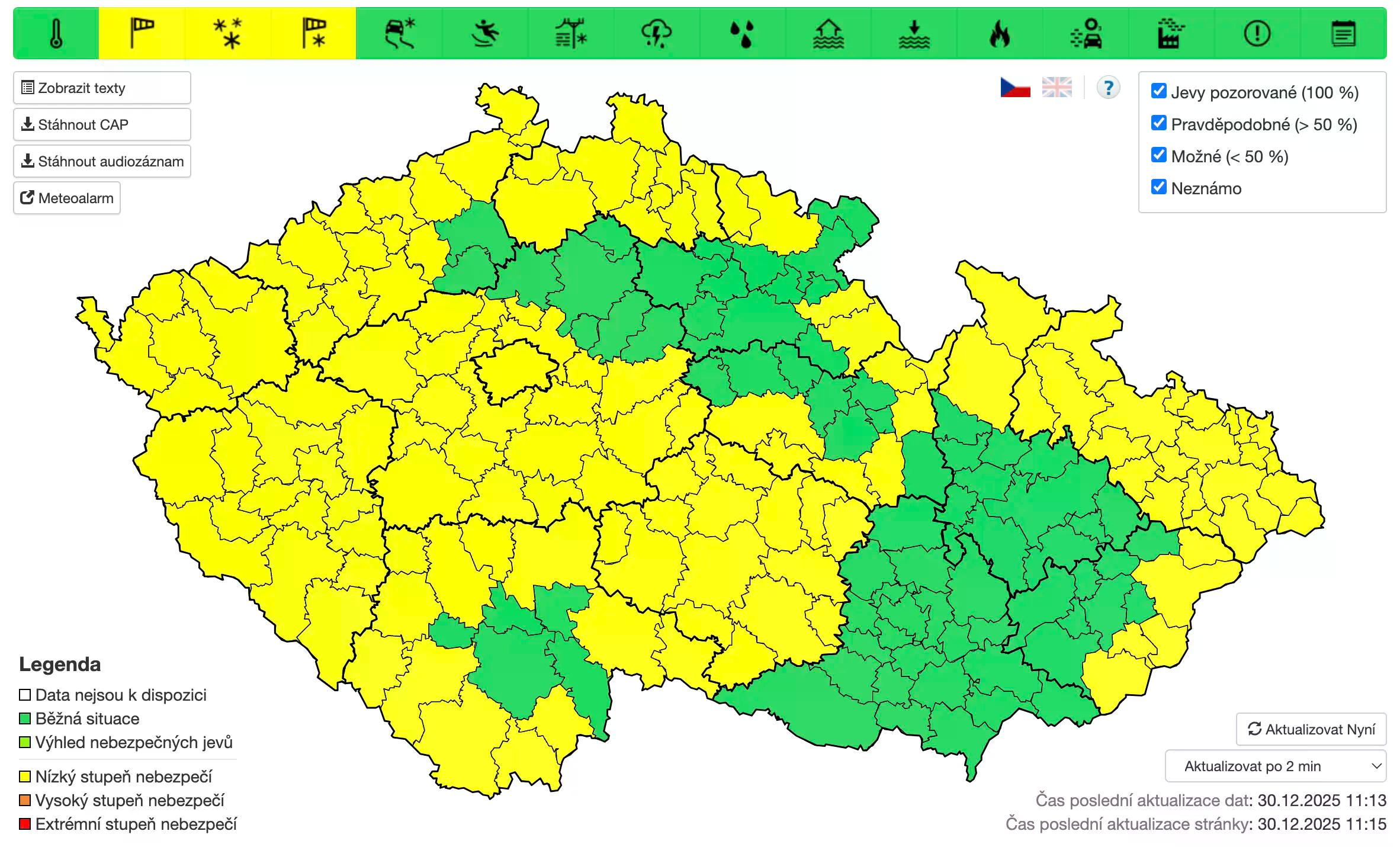 Na Nový rok vítr pak navíc zesílí i vítr. "Očekáváme čerstvý jihozápadní vítr, od čtvrtečního dopoledne do pátečního odpoledne s nárazy 15 až 20 m/s (55 až 70 km/h)," uvedli meteorologové. Varování před silným větrem platí od 1. 1. od 10 hodin dopoledne do 2. 1. do 16 hodin odpoledne.