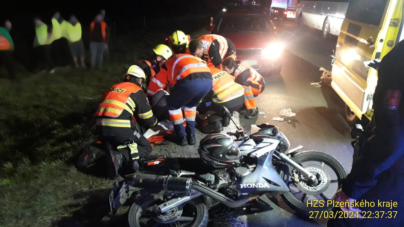 Podle mluvčího krajských hasičů Petra Poncara ke střetu došlo ve středu krátce před 22:30. "Zraněný motorkář skončil v péči lékařů, divočák srážku nepřežil. My jsme pomáhali zdravotnické záchranné službě s ošetřením raněného a následně jsme vozovku uklidili," uvedl s tím, že silnice musela být po dobu zásahu uzavřena.