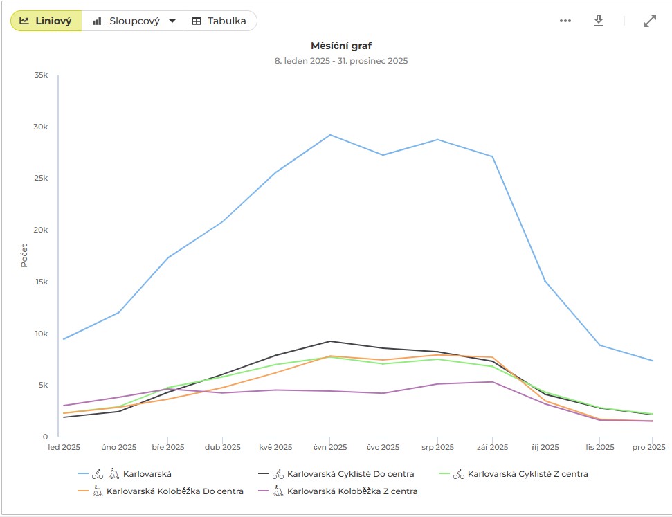 Od 8. ledna 2025 do konce loňského roku na cyklostezce U Prazdroje projelo přes 117 tisíc cyklistů a více než 24 tisíc koloběžek. Snímač v Karlovarské ulici za zmíněnou dobu zaznamenal 125 876 cyklistů a přes 102 tisíc koloběžek. Nejfrekventovanějšími dny byly v loňském roce úterý a čtvrtek. A průměry jsou 396 U Prazdroje a 638 cyklistů v Karlovarské za den. Z dat rovněž vyplynulo, že nejvíce cyklistů projelo úsekem U Prazdroje 13. března a kolem Rondelu 19. června. Březnový vrchol může ukazovat na nástup jarní sezóny a červnový rekord pravděpodobně souvisí s letním počasím a cestami za rekreací k Boleveckým rybníkům.