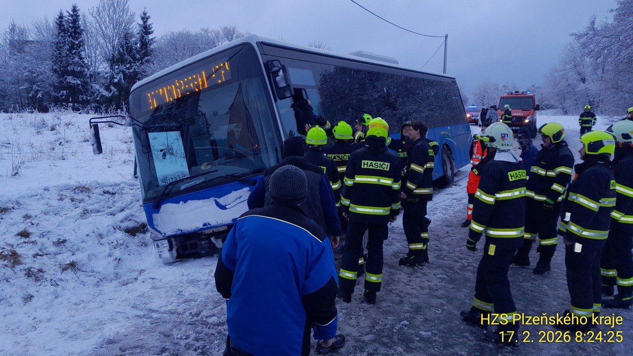Autobus převážející skupinu dětí sjel na silnici II/171 u obce Strašín ze silnice do příkopu, kde zůstal ležet na boku. Hasiči museli cestující dostávat z vozidla okýnkem u řidiče.