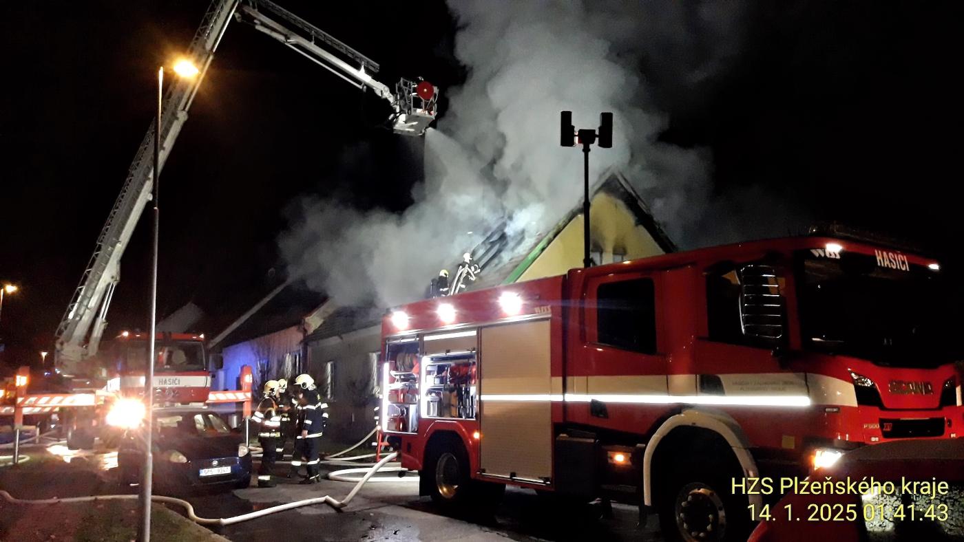 Pět hasičských jednotek vyjíždělo k požáru rodinného domu po 1. hodině. "Oheň zasáhl střechu a půdní prostor. Na hašení jsme nasadili tři útočné proudy. Využili jsme i výškovou techniku," uvedl mluvčí krajských hasičů Petr Poncar.