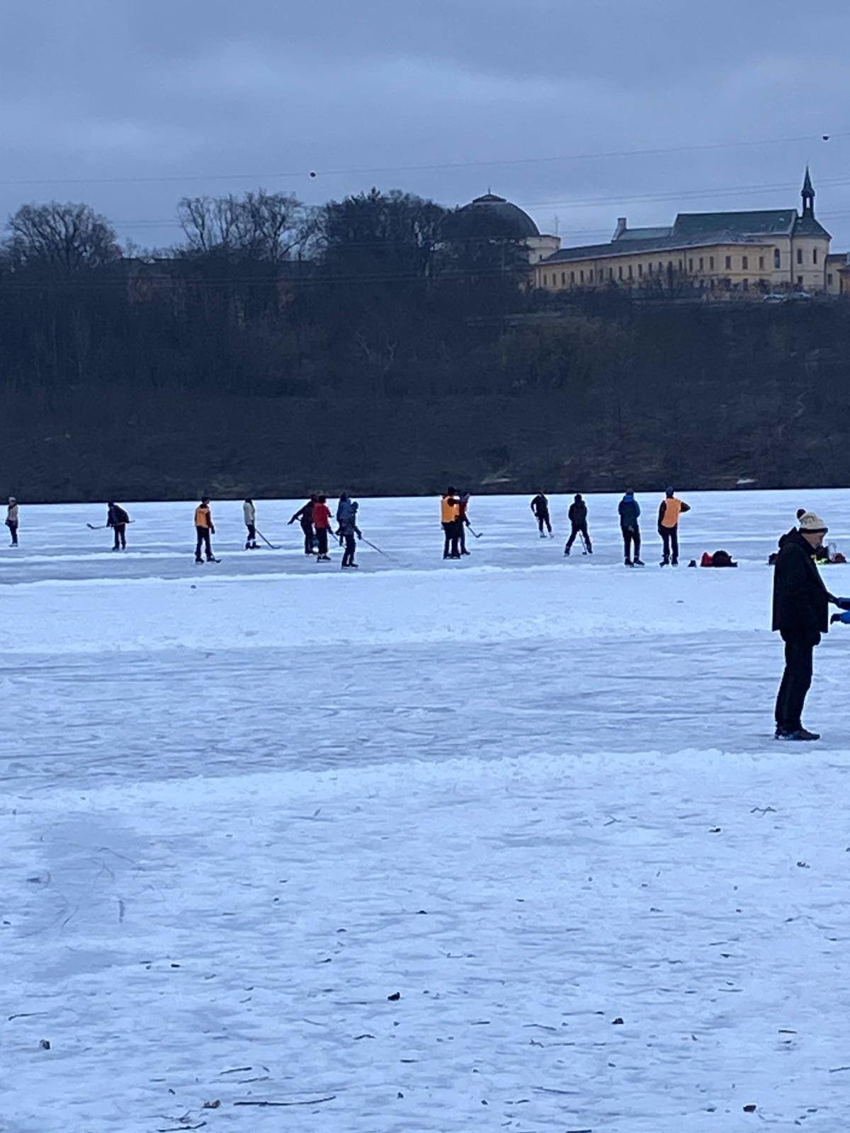 Plovoucí pontony, které v létě slouží rekreantům a v zimě nesou vánoční strom, získaly s příchodem mrazů novou funkci. Zamrzly v ledu tak pevně, že nyní bruslařům slouží jako ideální místo pro odpočinek nebo přezutí bruslí.