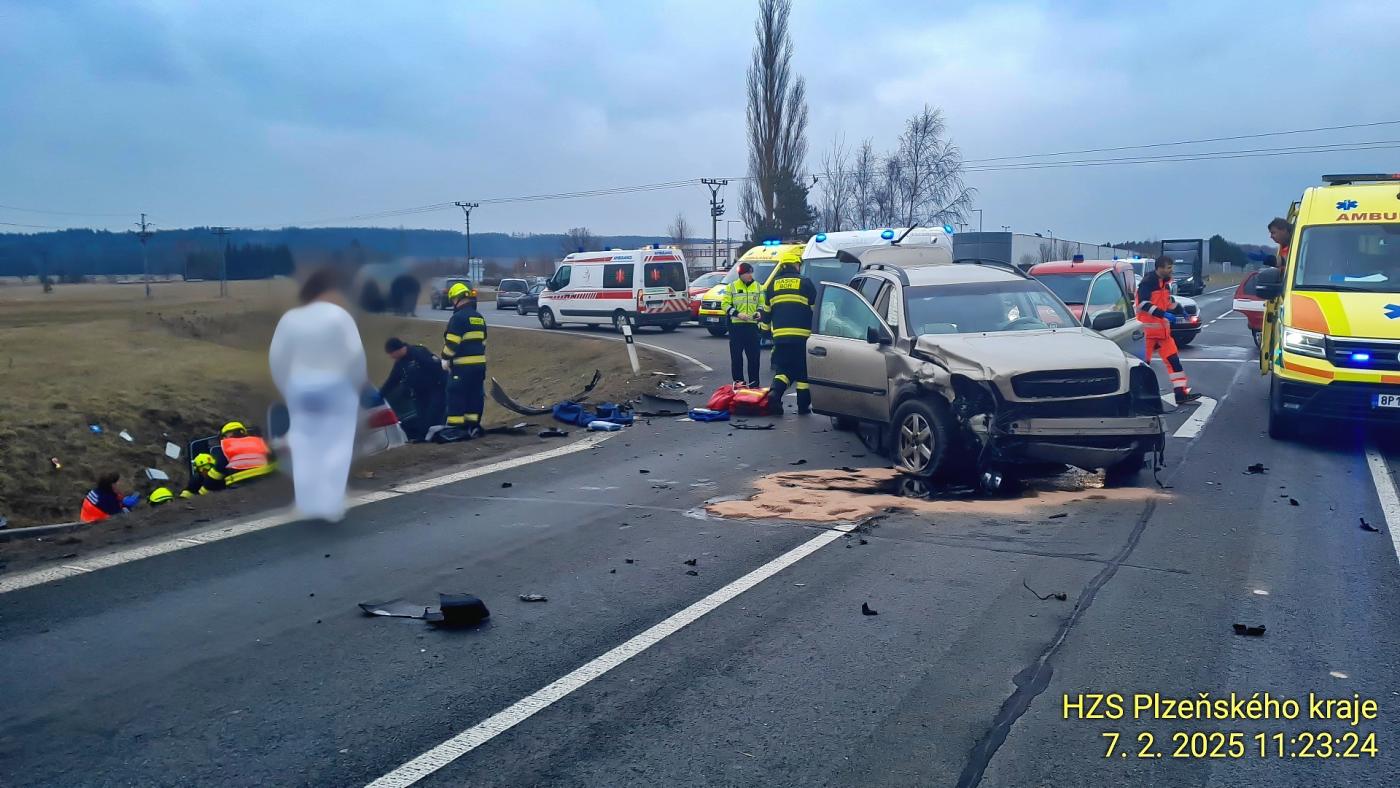 Vážná nehoda dvou vozidel zastavila dnes dopoledne provoz na silnici u Nové Hospody na Tachovsku. V autech cestovalo devět lidí, sedm z nich skončilo v nemocnici.