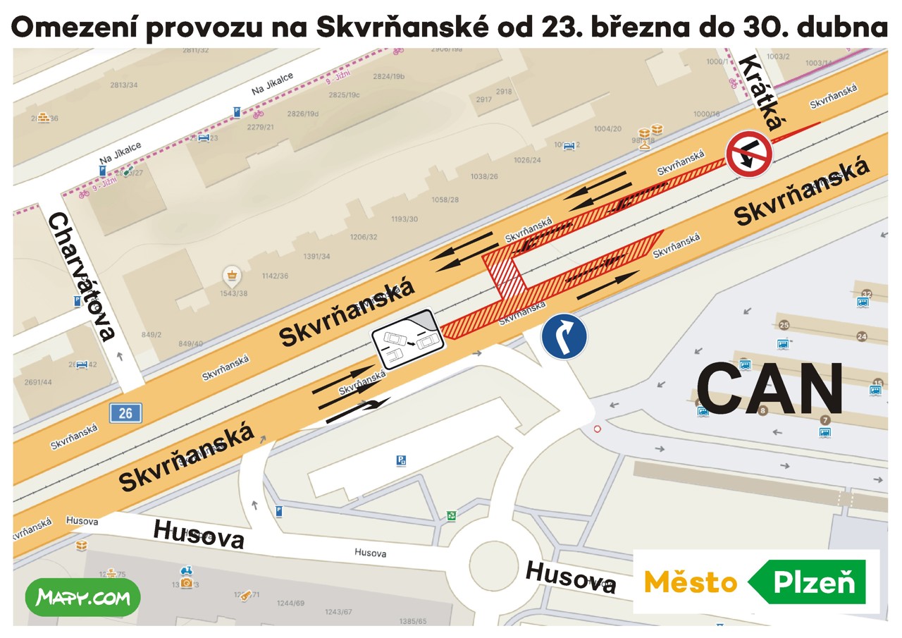 "V termínu 23. března až 30. dubna bude navíc také uzavřen přejezd na CAN na Skvrňanské ulici v obou směrech. To znamená, že autobusy vyjíždí na Skvrňanskou pouze ve směru centrum a od centra jedou na CAN po Skvrňanské a přes světelnou křižovatku do Tylovy a přes náměstí Emila Škody. Naopak od 23. března bude již otevřen přejezd v křižovatce Přemyslova x Kalikova, kde aktuálně probíhaly práce na tramvajové trati," uvedla tisková mluvčí Plzně Eva Barborková.