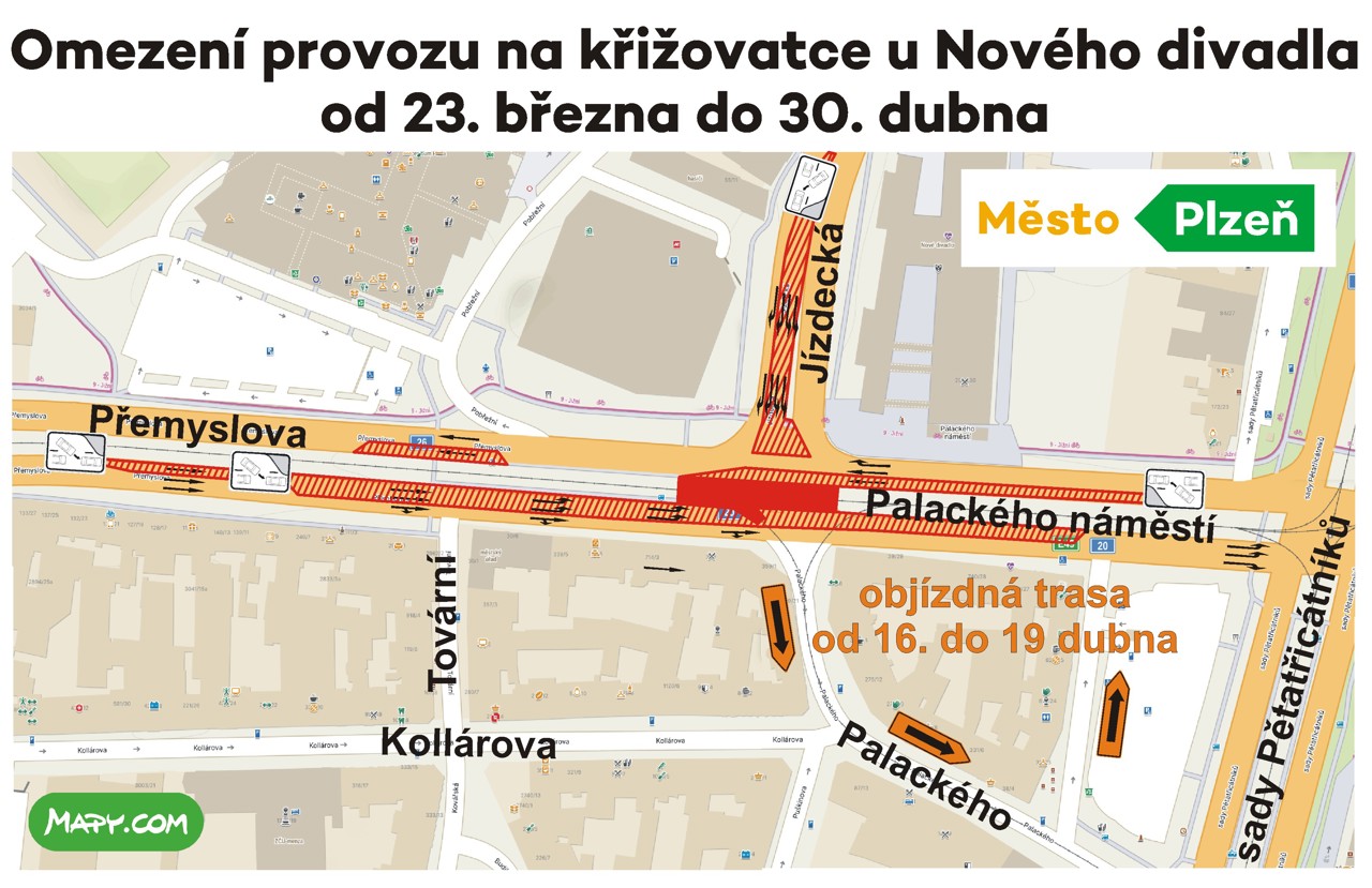 - Nebude možné jet od Skvrňan rovně do sadů Pětatřicátníků. Náhradní trasou je Palackého ulice a komunikace podél západních fasád, tedy kolem parkoviště v sadech Pětatřicátníků. V této krátké fázi bude přesměrována nákladní doprava od Skvrňan ve směru Klatovy a ve směru Karlovy Vary ze Skvrňanské ulice do ulice Husova.